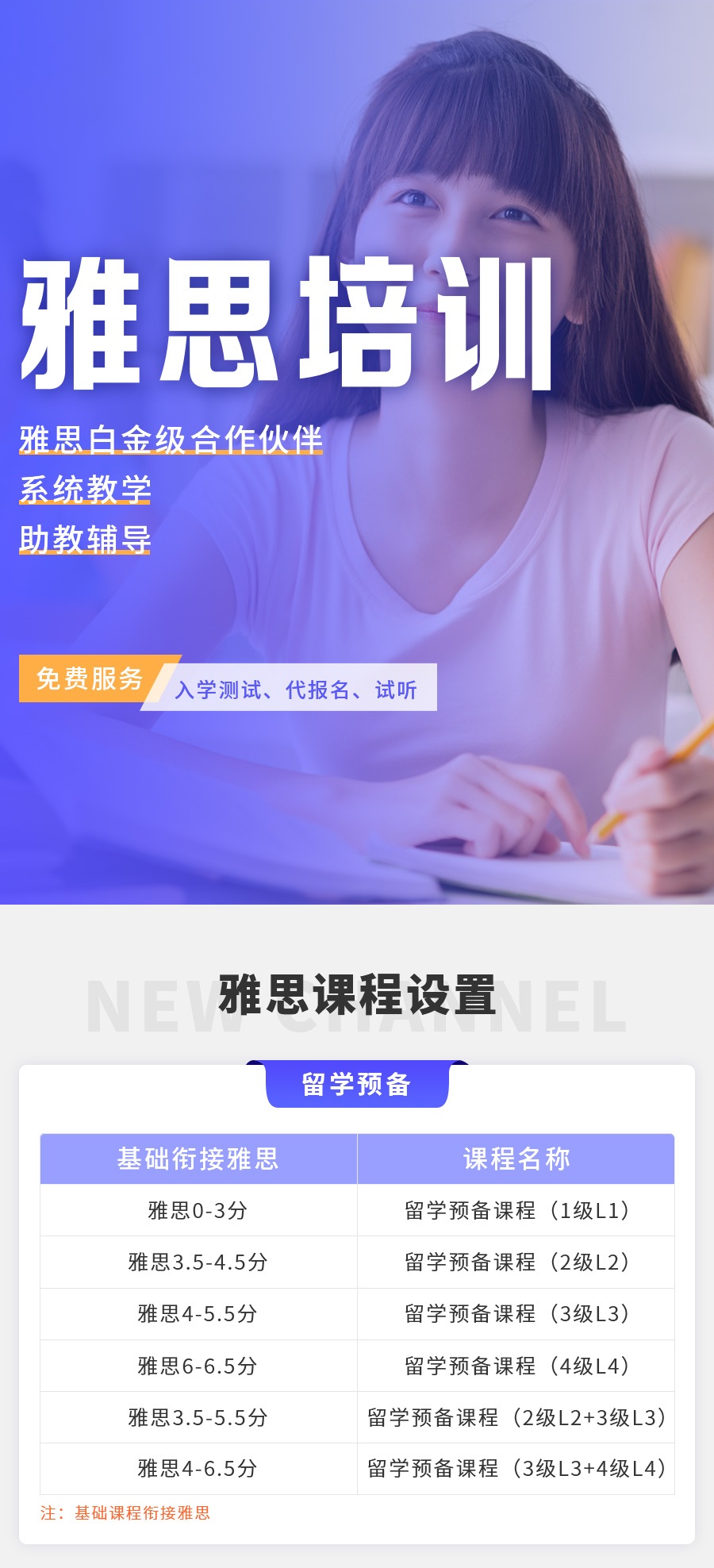 新航道是新航道国际教育集团(NewChannel International Education Group Limited)的简称,由胡敏教授率领团队成员于2004年10月16日共同创办,总部位于北京海淀区中关村。美国国际数据集团(IDG)和美国KAPLAN国际教育集团参与战略投资的语言教育机构。下辖语言培训学校、前程留学、国际研学、好轻松考研、中国故事研究院、美国AP课程中心、锦秋A-Level、教育研究院、新英汉图书、AF国际艺术教育、美行思远国际音乐教育、清美A佳画室等多个分支机构,提供IELTS(雅思)、TOEFL(托福)、GRE、GMAT、SAT、ACT、AP、SSAT、留学英语能力预备课程和外教口语等优质出国考试培训课程。通过制订和实施精准的学习方案,希望学员通过不断学习提升英语能力和考试成绩,同时熟练掌握海外学习所需的批判性思维、社会交往和团队协作能力。个性化、精品小班、全封闭学习模式,满足不同学员的不同学习需求。